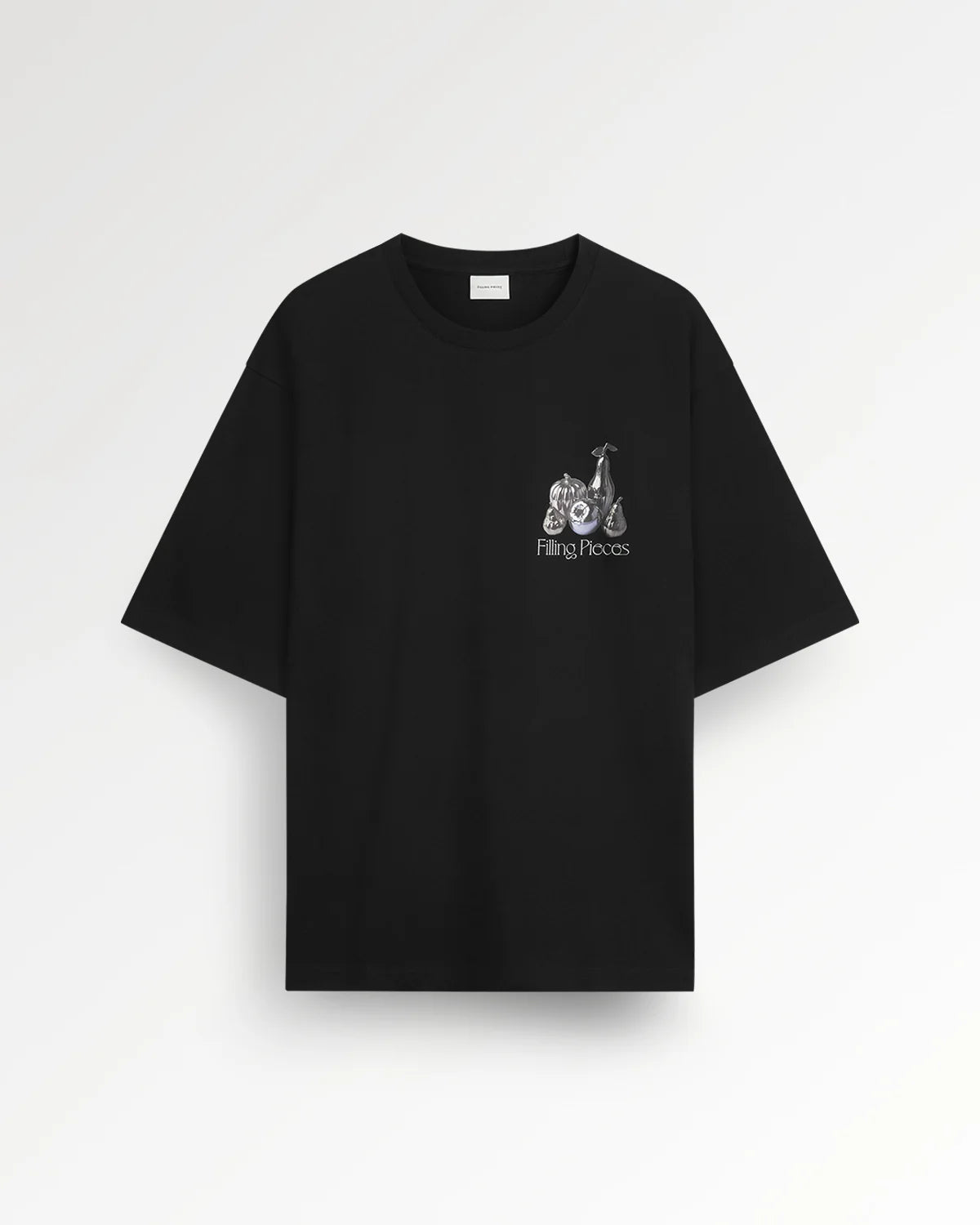 The T-shirt Boxy Chrome Fruit is crafted from a premium 100% organic cotton, offering a substantial, structured feel. This classic Black version provides a striking, moody backdrop for its outspoken graphic. The 'Chrome Fruit' composition is a key seasonal artwork, expressing the contradiction of soft, colorful, aging fruits captured in an immortal, reflective state. Cut for a modern, boxy fit, this tee is a true statement piece that merges high-end artistry with everyday comfort.