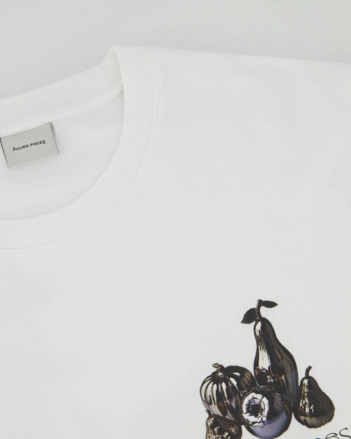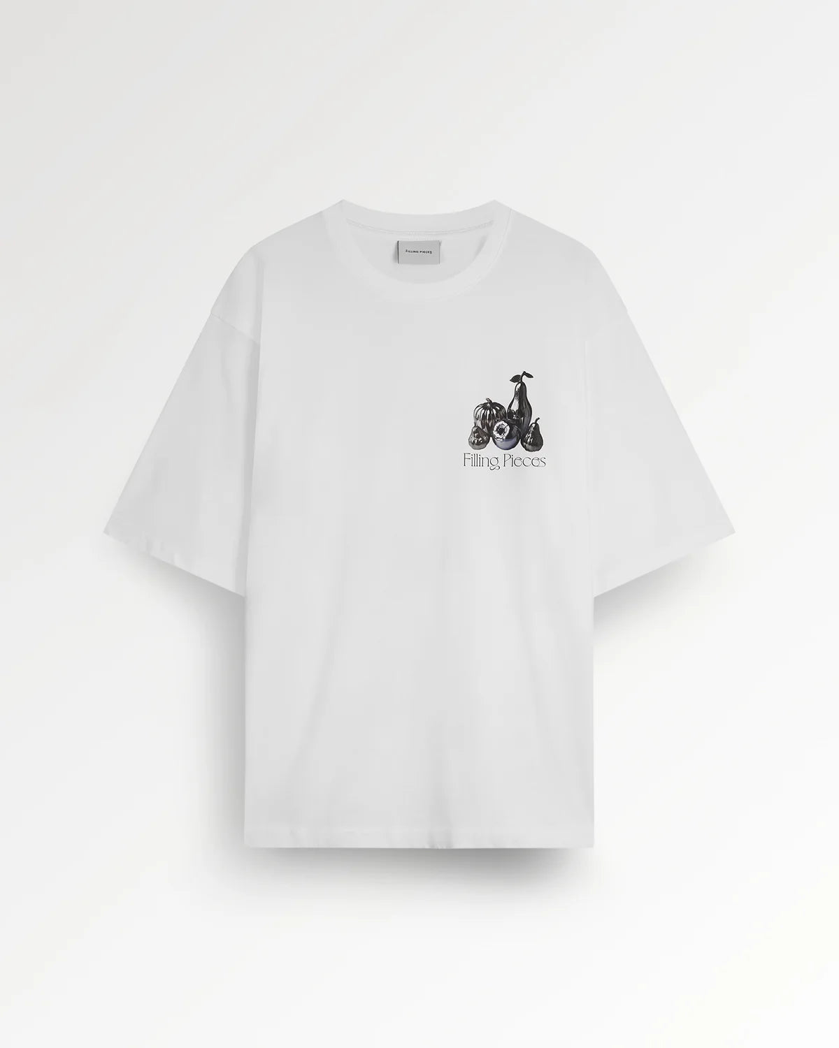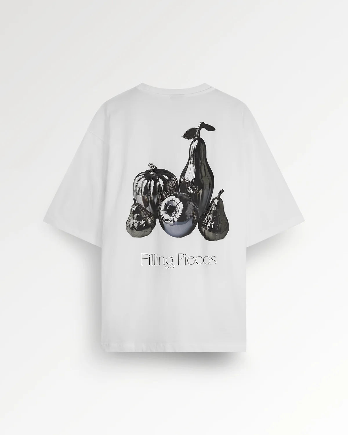 The T-shirt Boxy Chrome Fruit is crafted from a premium 100% organic cotton, offering a substantial, structured feel. This clean White version is the perfect canvas for its outspoken graphic. The 'Chrome Fruit' composition is a key seasonal artwork, expressing the contradiction of soft, colorful, aging fruits captured in an immortal, reflective state. Cut for a modern, boxy fit, this tee is a true statement piece that merges high-end artistry with everyday comfort.