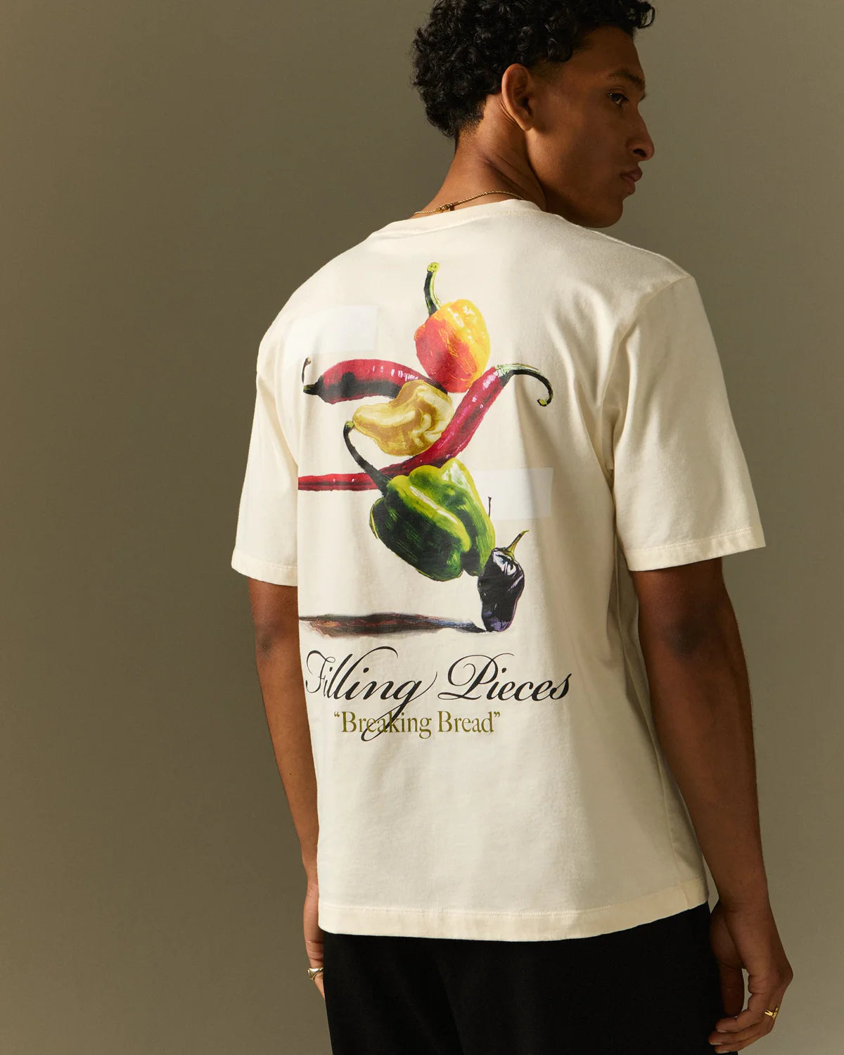 Serving as a wearable canvas, the T-shirt Pepper is a celebration of global cuisines. The clean Antique White base is the perfect canvas for its exclusive, hand-painted artwork. The graphic is a "balancing act of the peppers of the world," showcasing a composition of different peppers that stem from diverse cuisines and cultures. Cut for a clean, regular fit, this tee is a true statement of cultural appreciation and artistry.