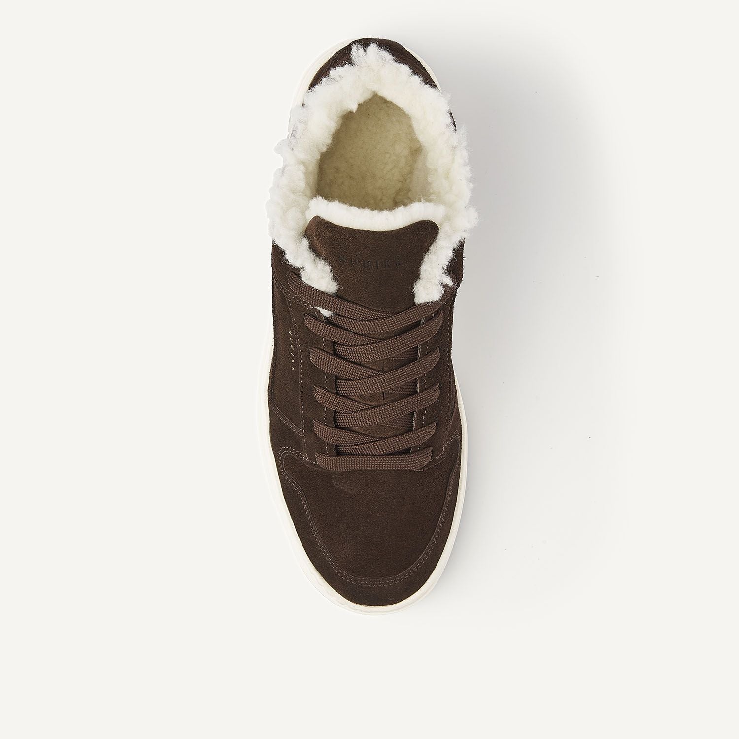 • Hoogwaardig soepel donkerbruin suède en wollen voering