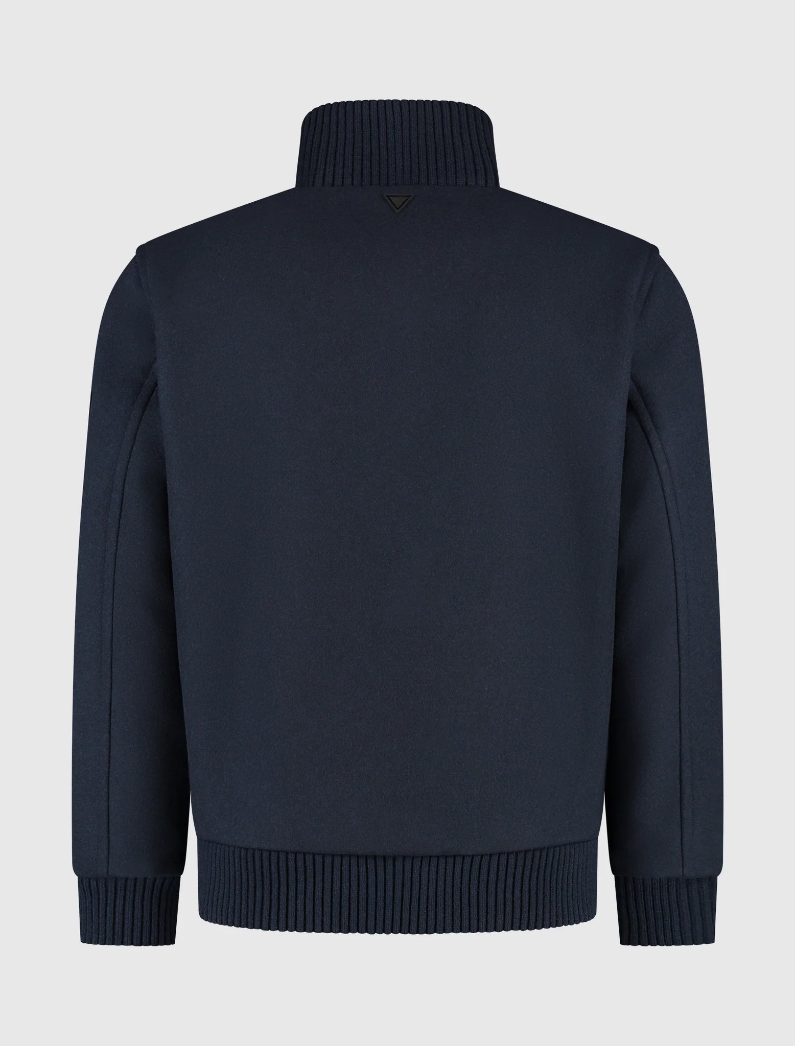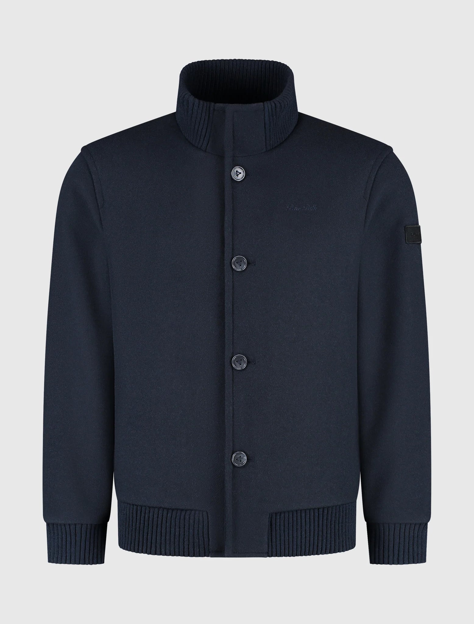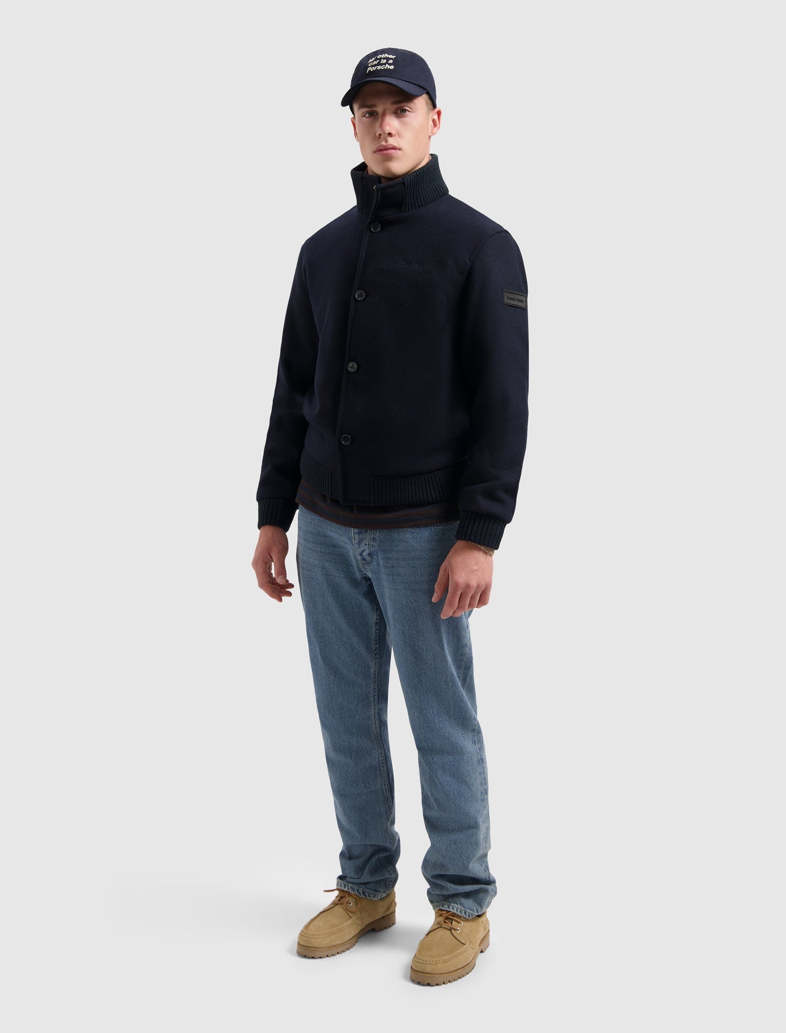 The Wool Bomber Jacket comes in a regular fit, made from a blend of 40% wool, 55% polyester, and 5% other fibers, with a 100% polyester lining. Wool adds natural warmth and comfort, balanced with durability from the blend. Designed with a standing ribbed collar and button closure. Ribbed body and cuffs add structure, while two side pockets and two inner pockets provide practical storage. Finished with an embroidered handwritten logo on the chest and a logo badge on the sleeve.