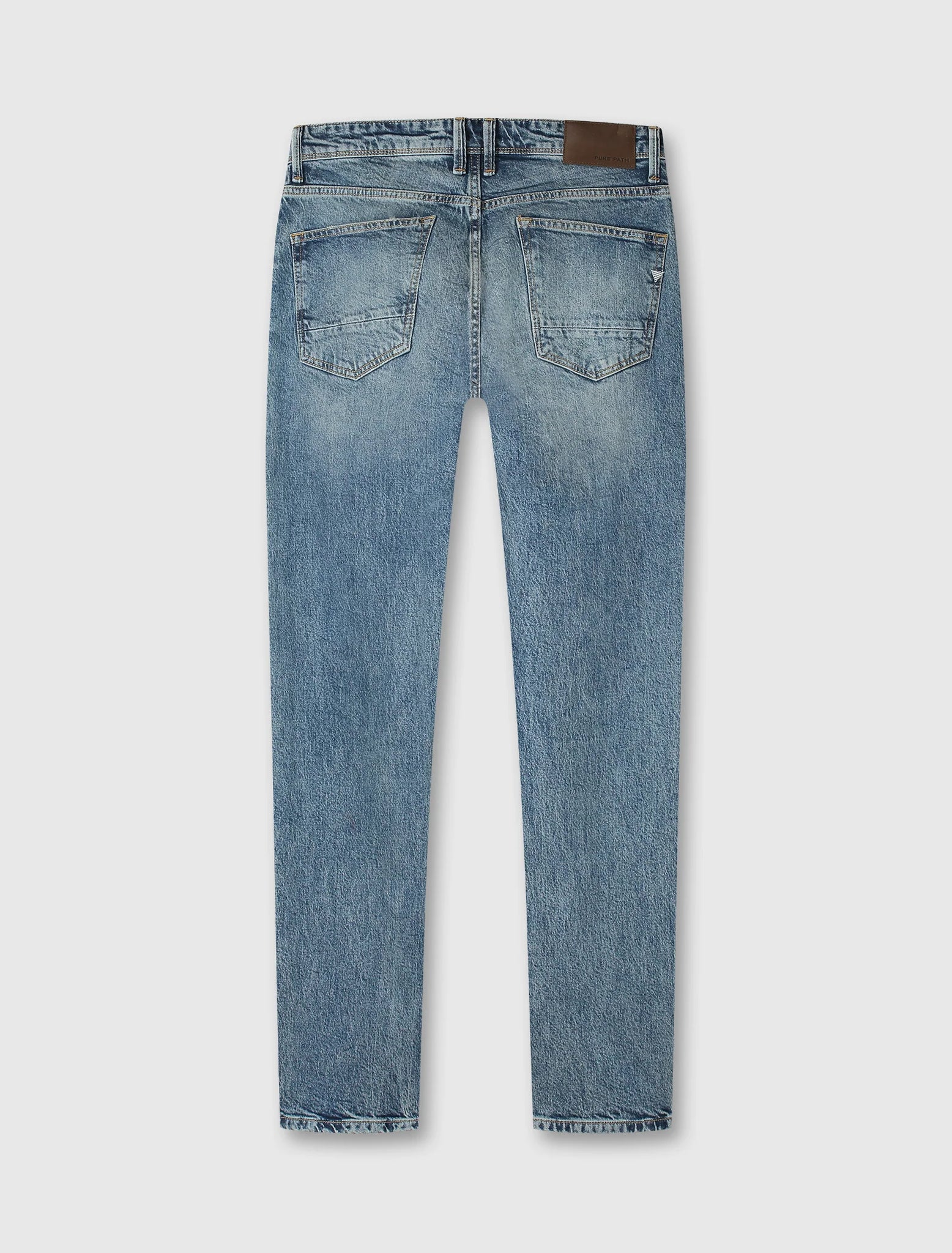 The Ryan Slim Fit jeans in Denim Blue Green are cut with a tapered leg and made from a denim blend of 61% cotton, 38% lyocell, and 1% elastane. Treated with a stone wash and tinted finish for tonal richness, with 3D whiskers adding depth. Rip & repair details and subtle damage give a lived-in edge. Features include a button-fly, front and back pockets. Finished with our denim signature branding, including triangle embroidery and a leather logo patch.