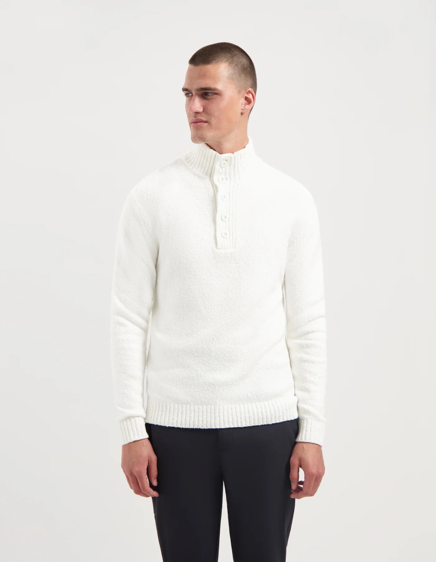 De ANDY is een moderne knit met opstaande ribkraag en knoopsluiting. Het katoenmix materiaal voelt zacht aan en zorgt voor optimaal comfort.