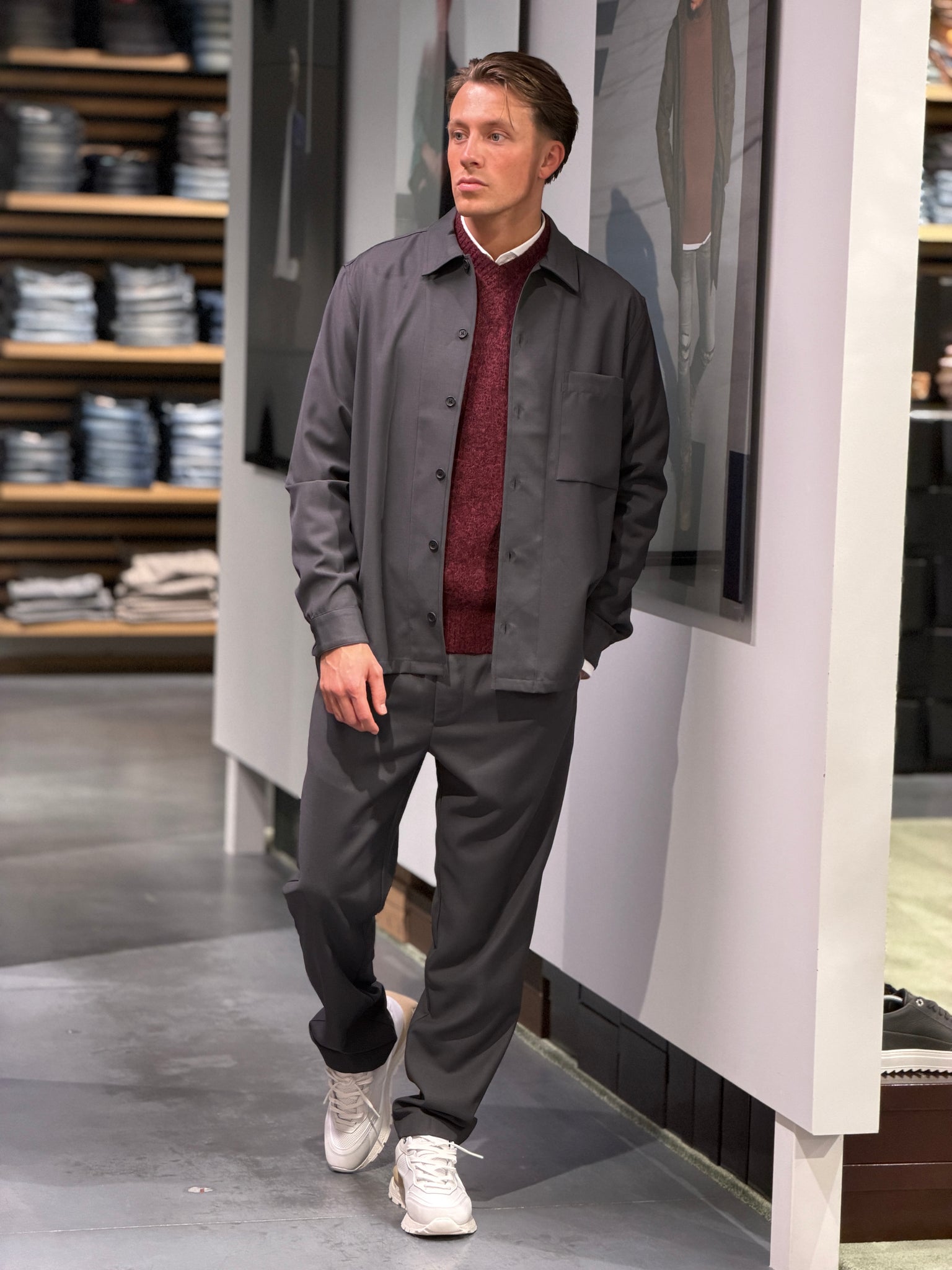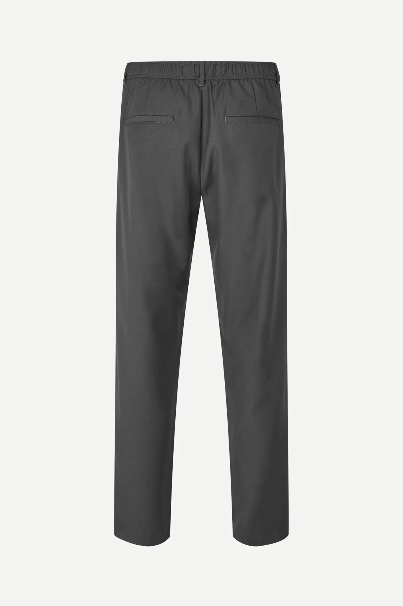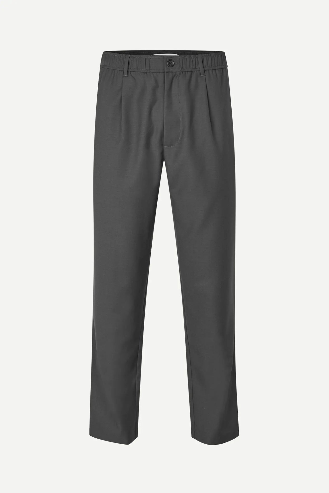 Mid-waist trousers with a regular fit and straight leg. Elasticated waistband with button and zipper closure. Side slit pockets on the front and welt pockets on the back. Single pleats on the front. Belt loops. Main material made from a blend of recycled polyester and wool.