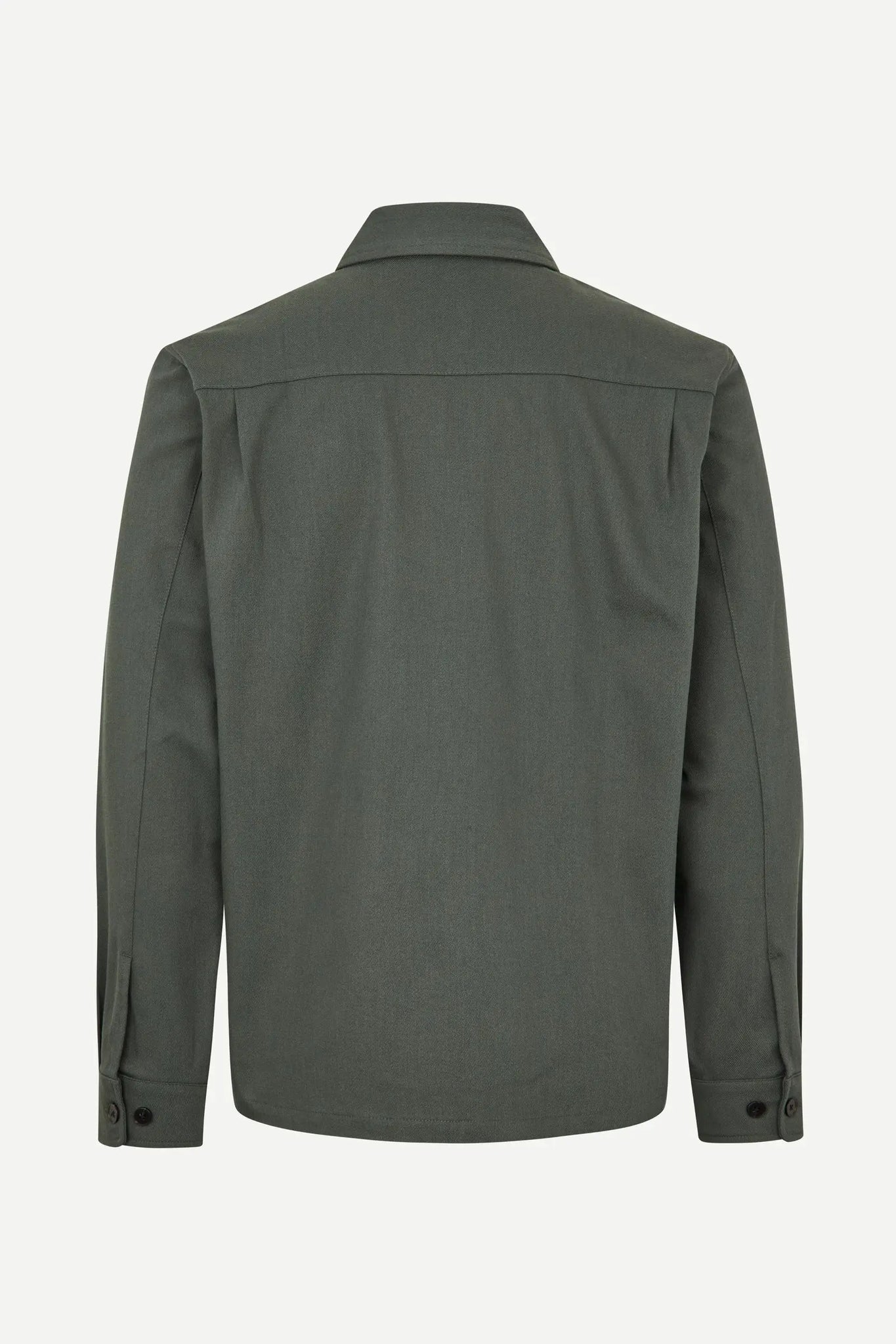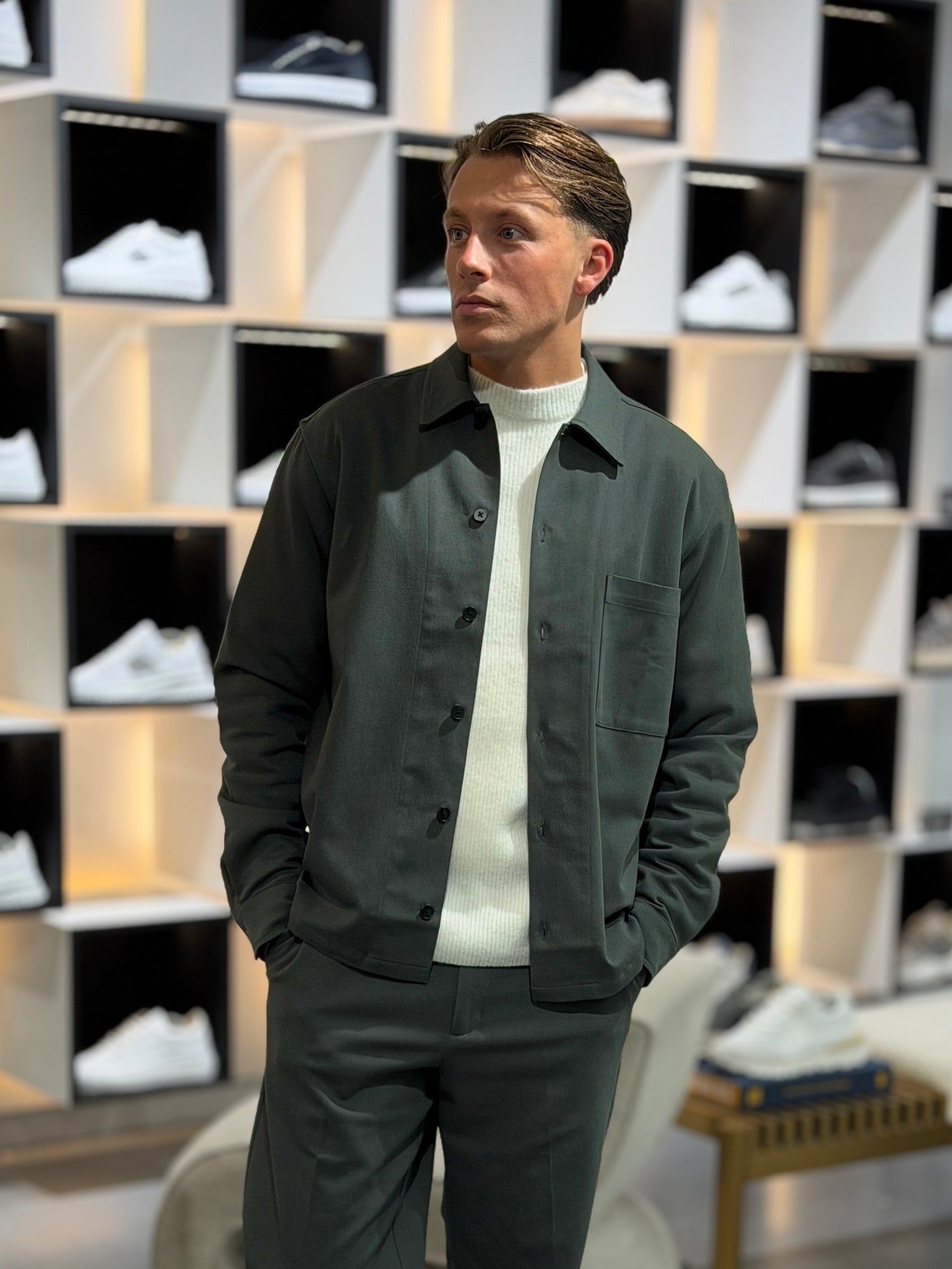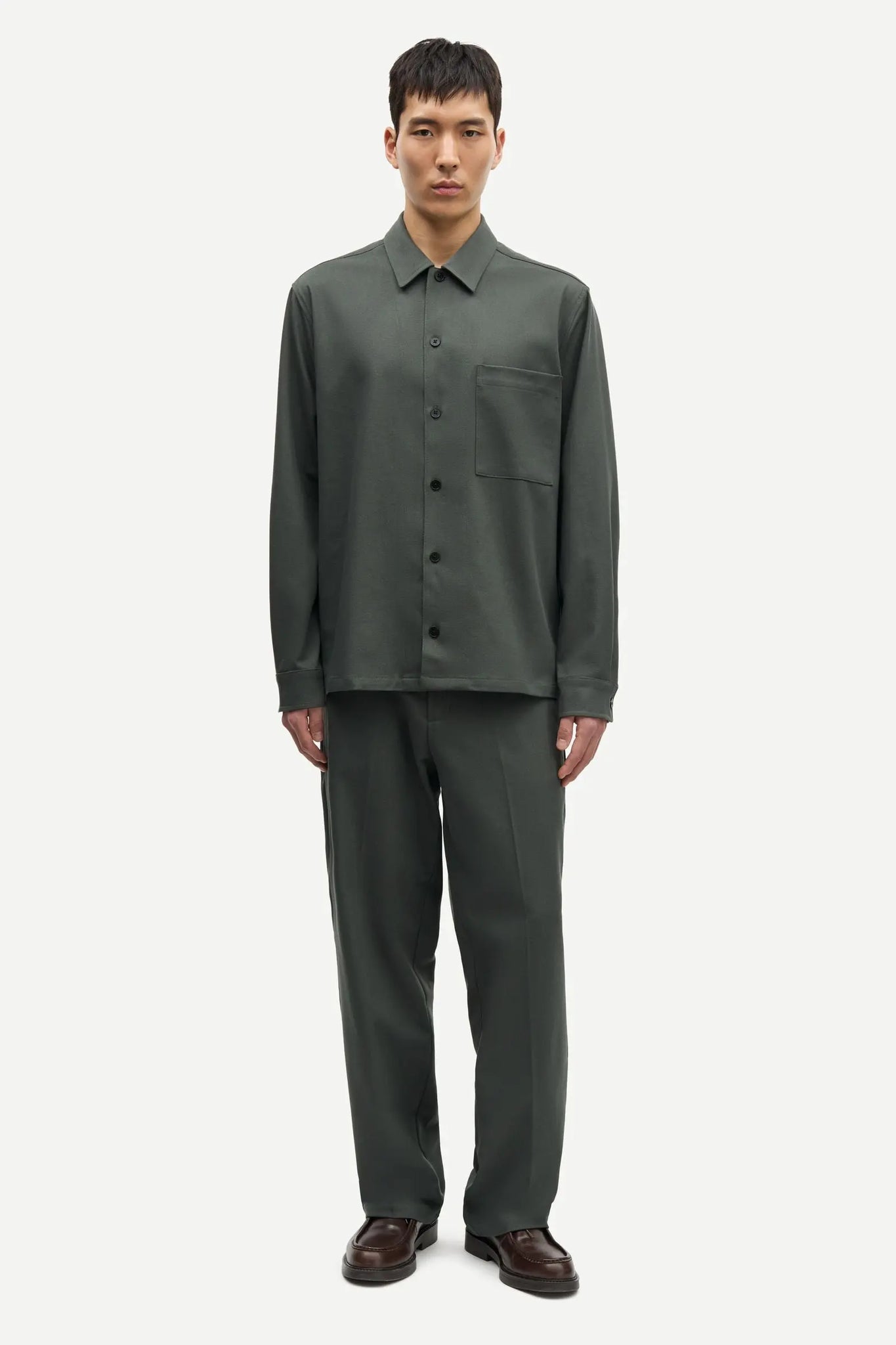 Long-sleeved shirt with a loose fit. Button closure on the front and buttoned cuffs. Patch pocket at the chest. Neck yoke seam. Main material made from an elastic blend of cotton and wool.