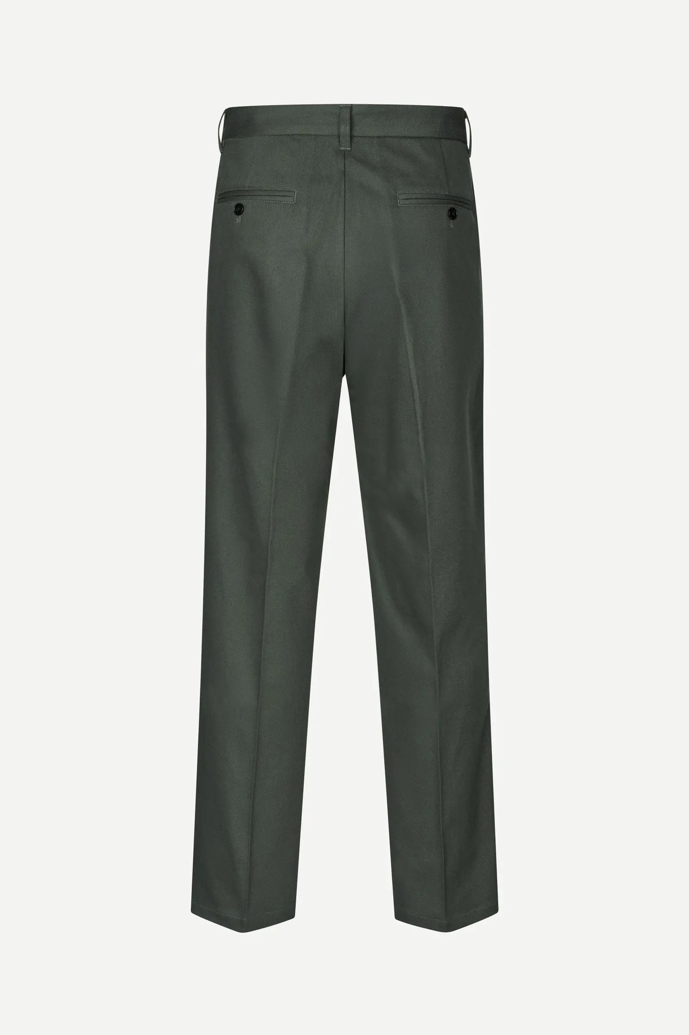 Trousers with a loose fit and straight leg. Button and zipper closure at the fly. Side slit pockets on the front and buttoned welt pockets at the back. Belt loops. Pressed pleats on the front and back. Main material made from an elastic blend of cotton and wool.